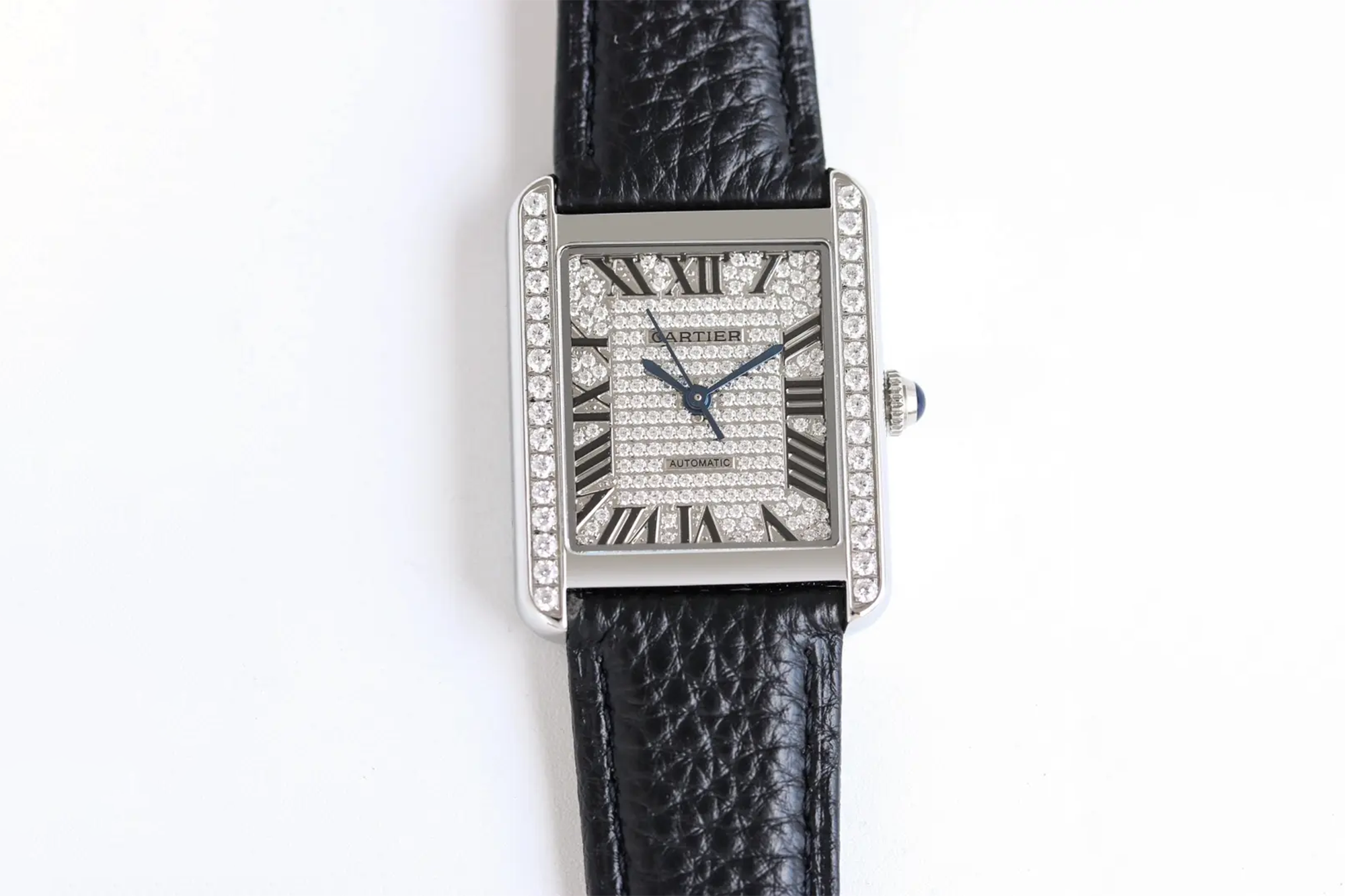 Cartier Tank MK3 Women’s Automatic Mechanical Watch – Silver with Diamond Bezel, Black Leather Strap