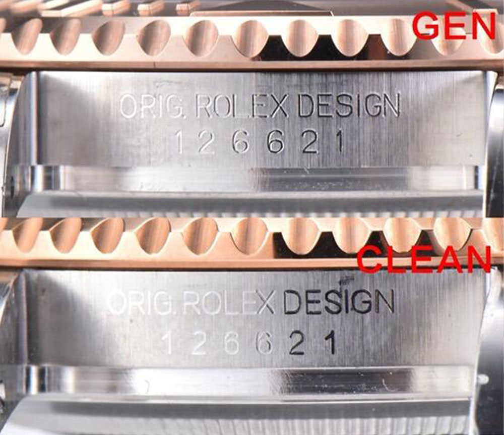 - Genuine: The serial and reference number are engraved in greater depth to create a more pronounced contrast with the metal surface. This depth is in line with Rolex’s strict quality standards to ensure permanence and readability.