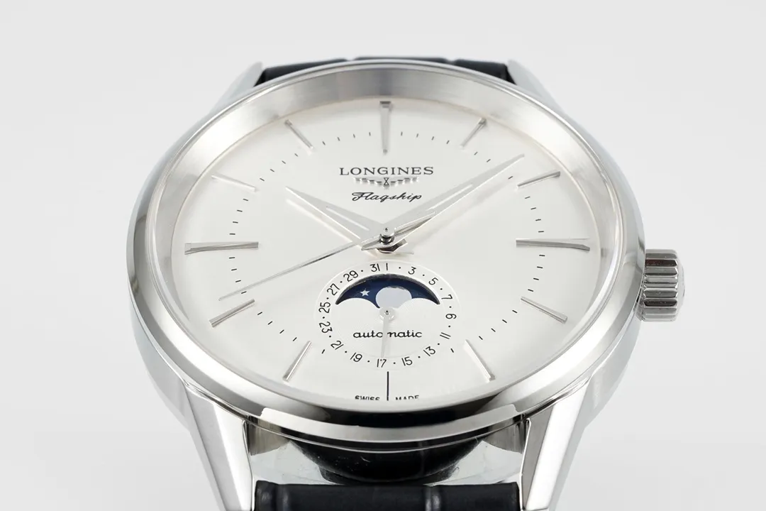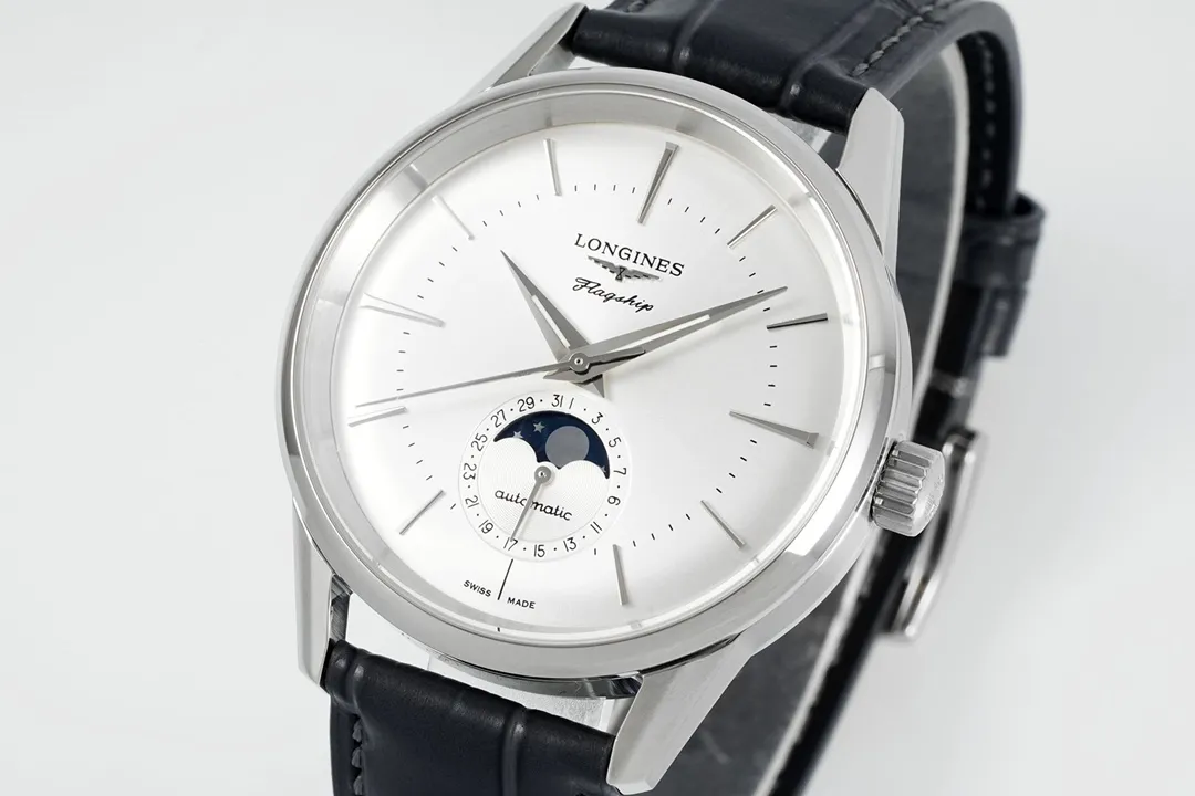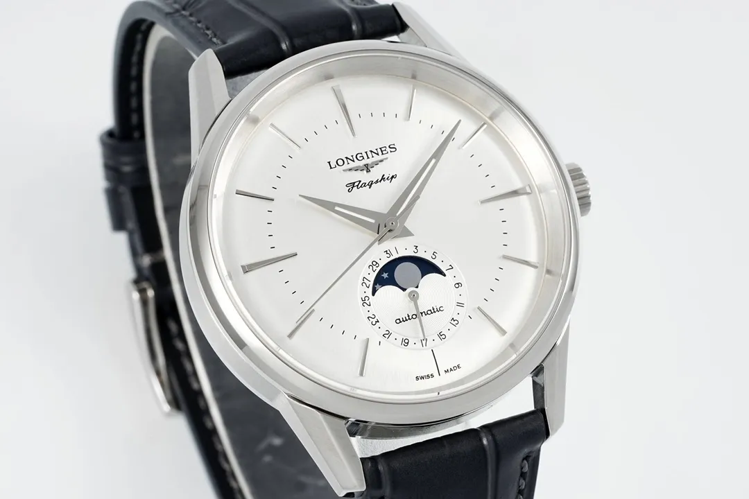 Longines Classic Flagship Moonphase Watch – Silver Dial, Black Leather Strap