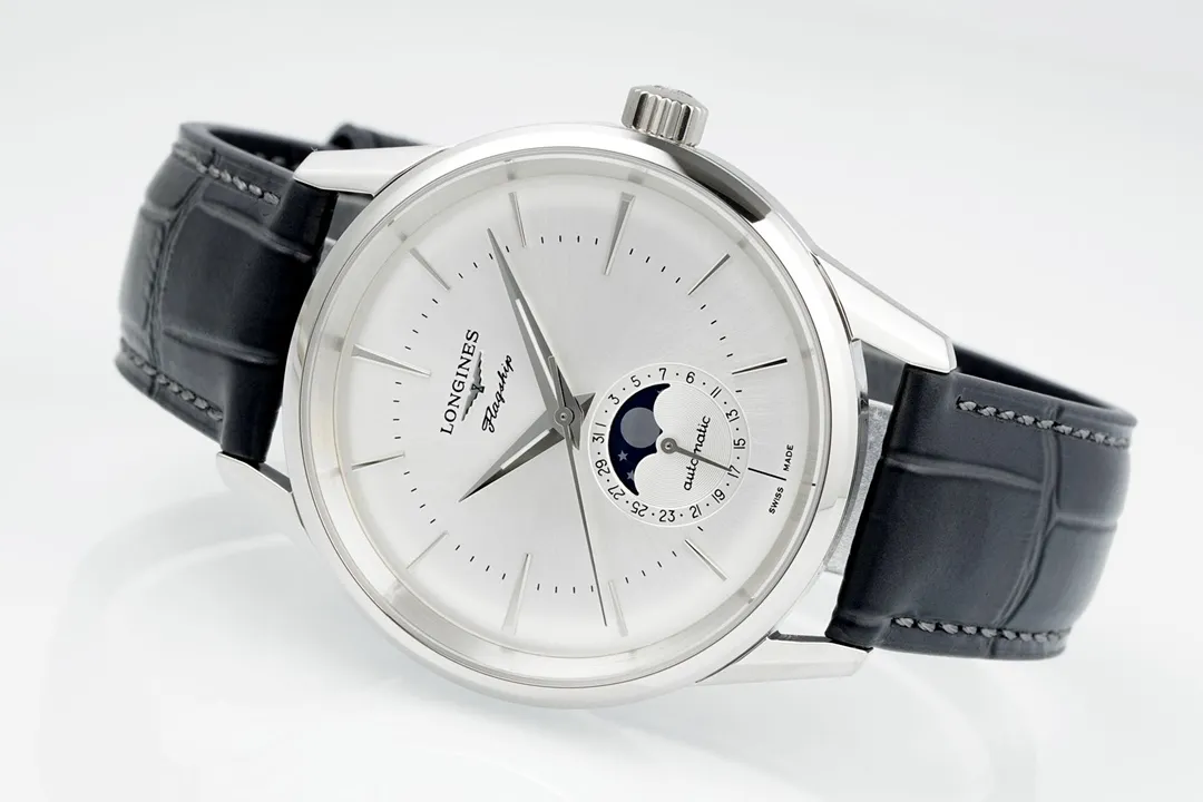 Longines Heritage Classic Flagship Moonphase Watch – Silver Dial, Black Leather Strap
