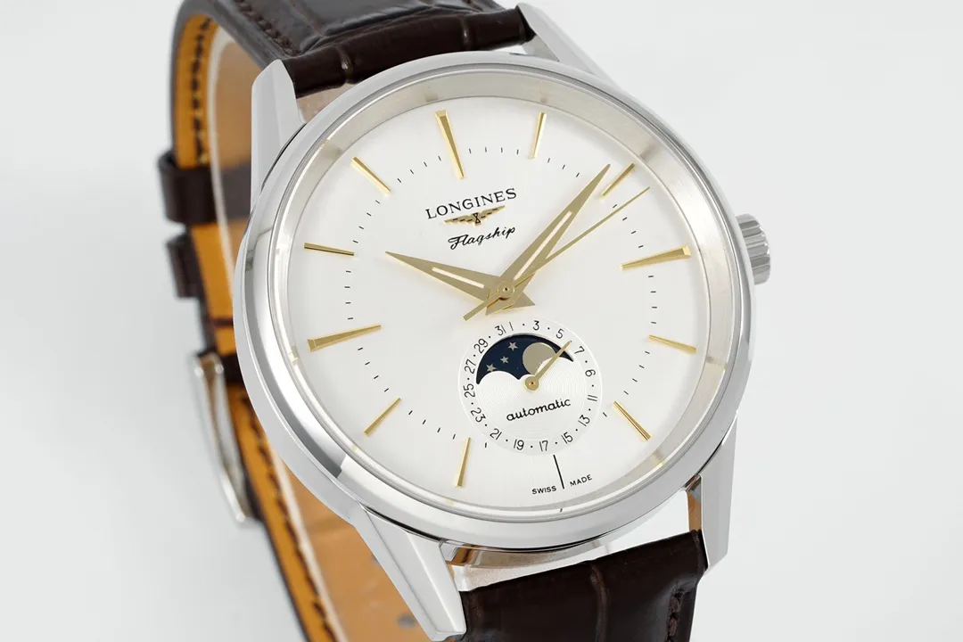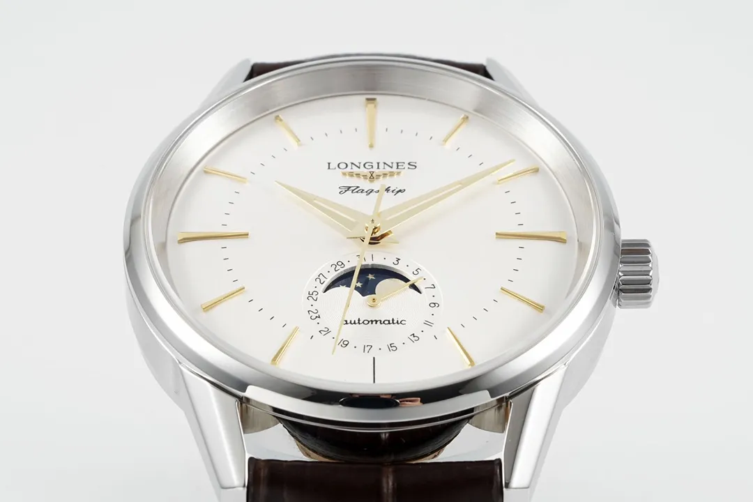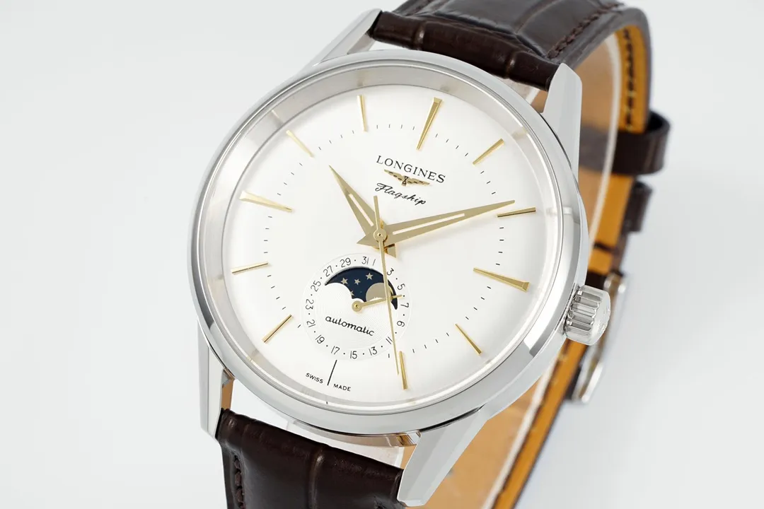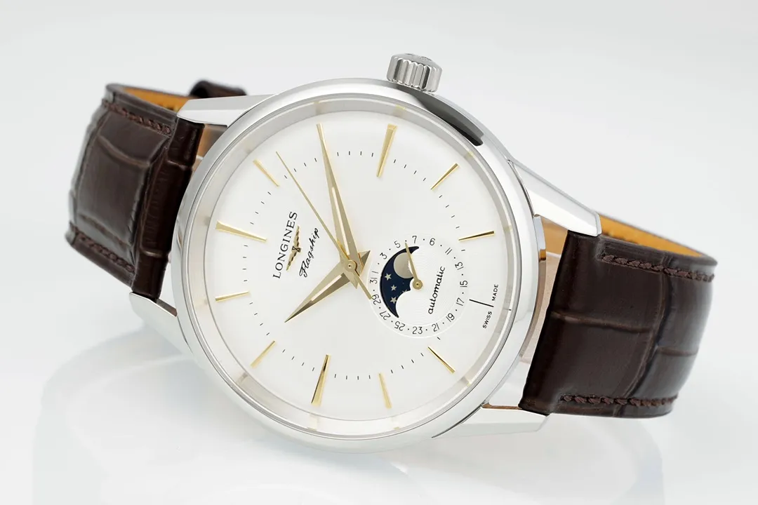 Longines Heritage Classic Flagship Moonphase Watch – Silver Dial, Brown Leather Strap, Vintage Style