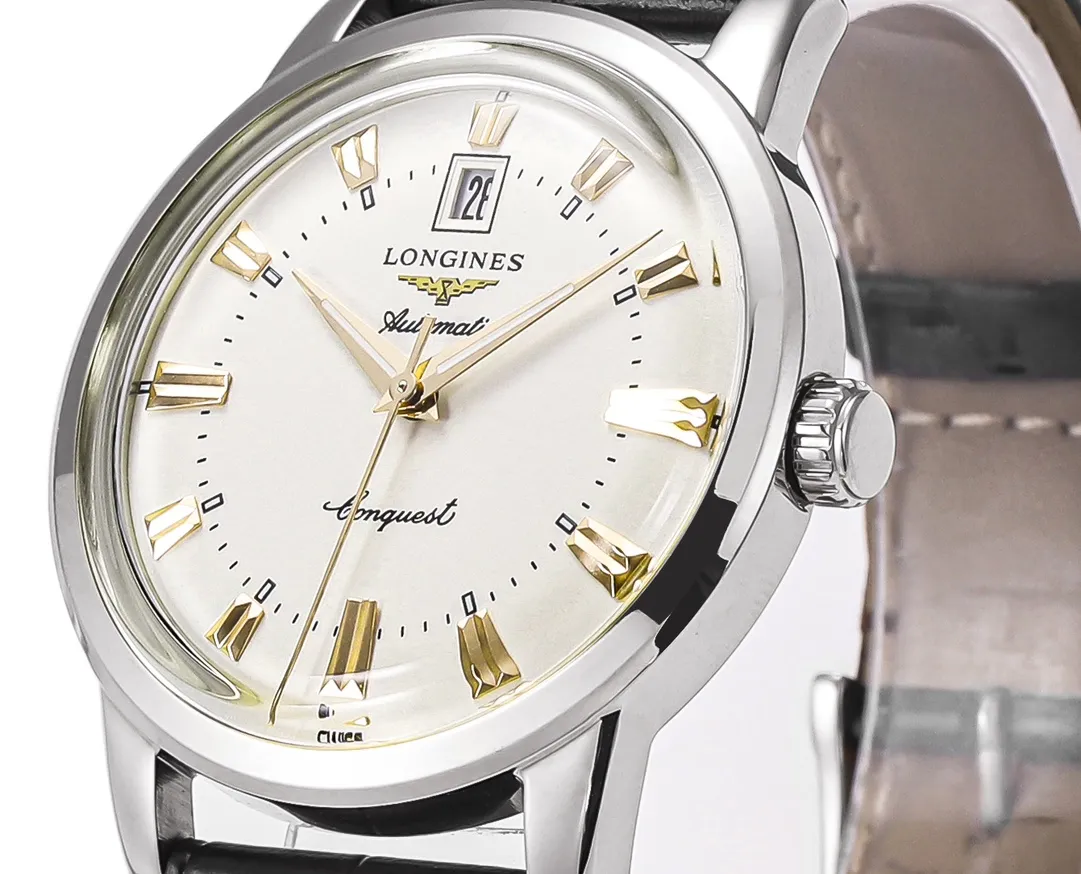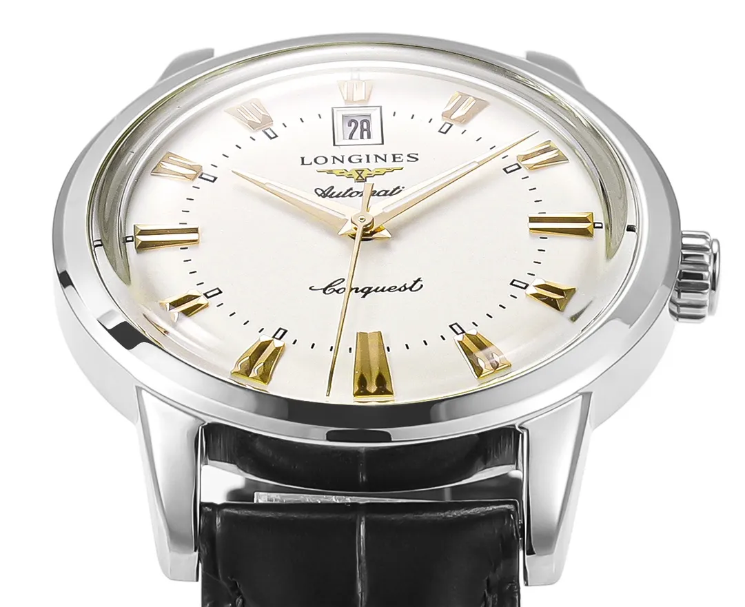 6 reviews for Longines Heritage Conquest Classic Re-Edition “Cyclops” Watch – Silver Dial with Gold Markers, Black Leather Strap