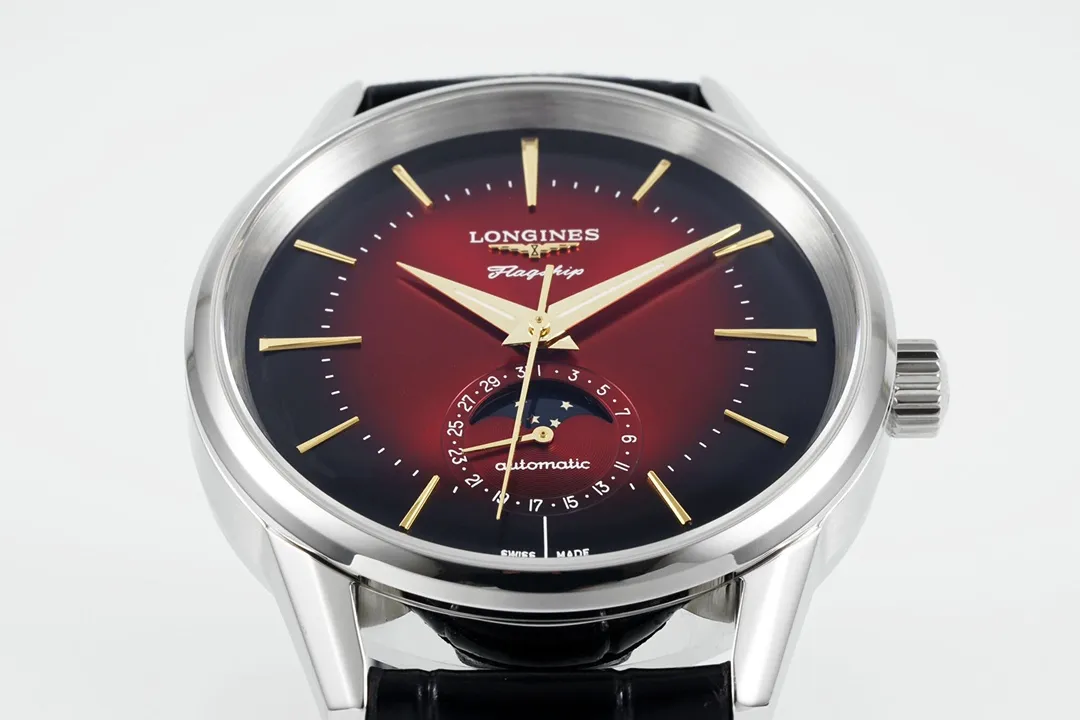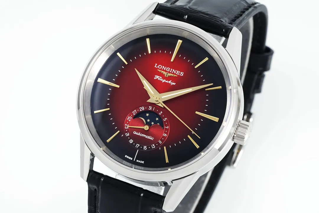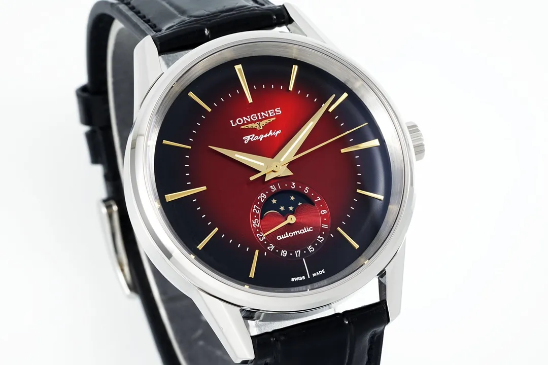 The Longines Flagship Classic watch features a stunning red dial with a moon phase function, encased in a 38.5mm case, and paired with a black leather strap. Its design draws from a 1975 vintage model, blending elegance with modern functionality. This exquisite timepiece is a perfect choice for those seeking a high-quality Replica Watches that mirrors the craftsmanship of the original. Whether you’re a collector or simply appreciate fine watches, this watch replica offers unmatched style and precision with a touch of Swiss Replica sophistication.