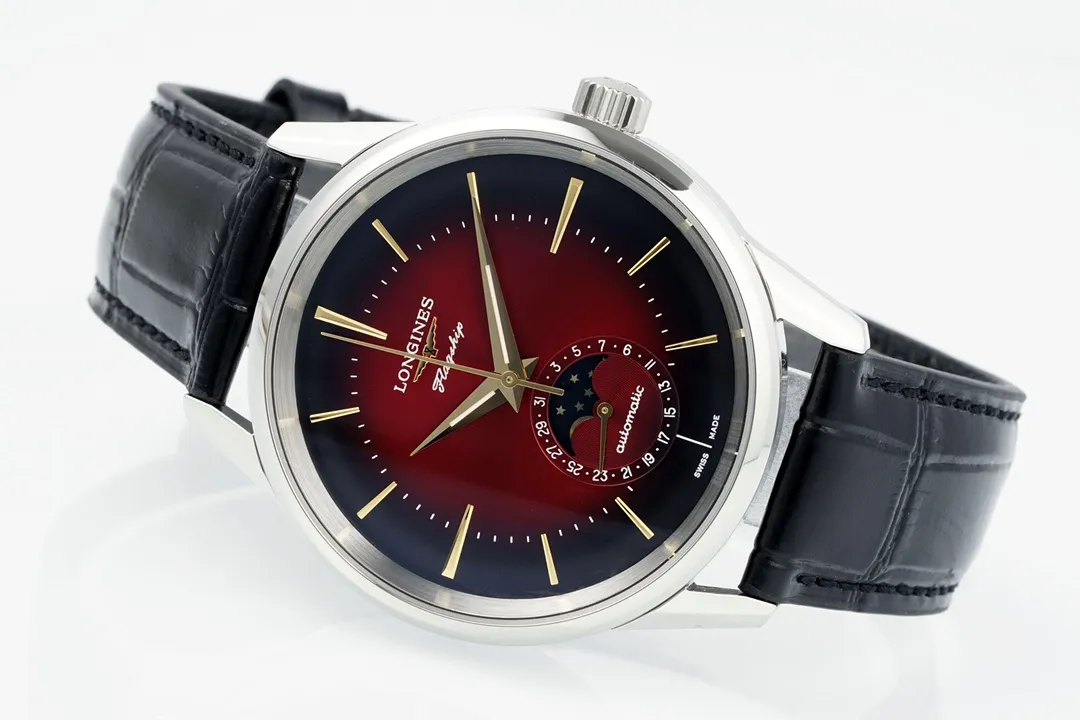 7 reviews for Longines Heritage Flagship Classic Red Dial Moon Phase Automatic Watch with Black Leather Strap