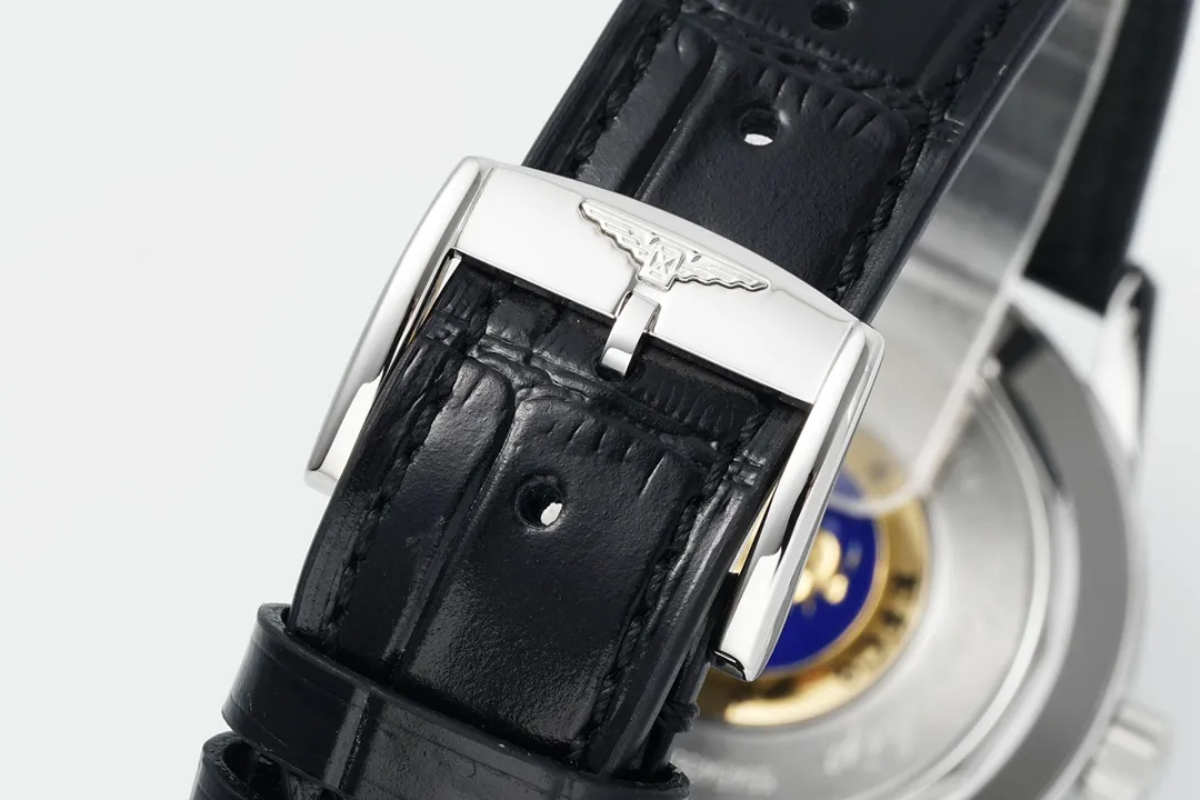 – **Black Leather Strap**: The watch is complemented with a black leather strap, offering a luxurious and comfortable wear.