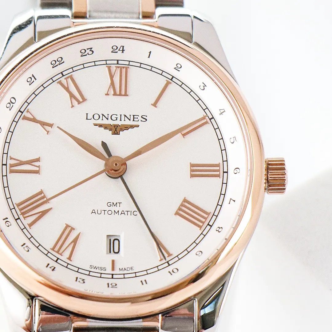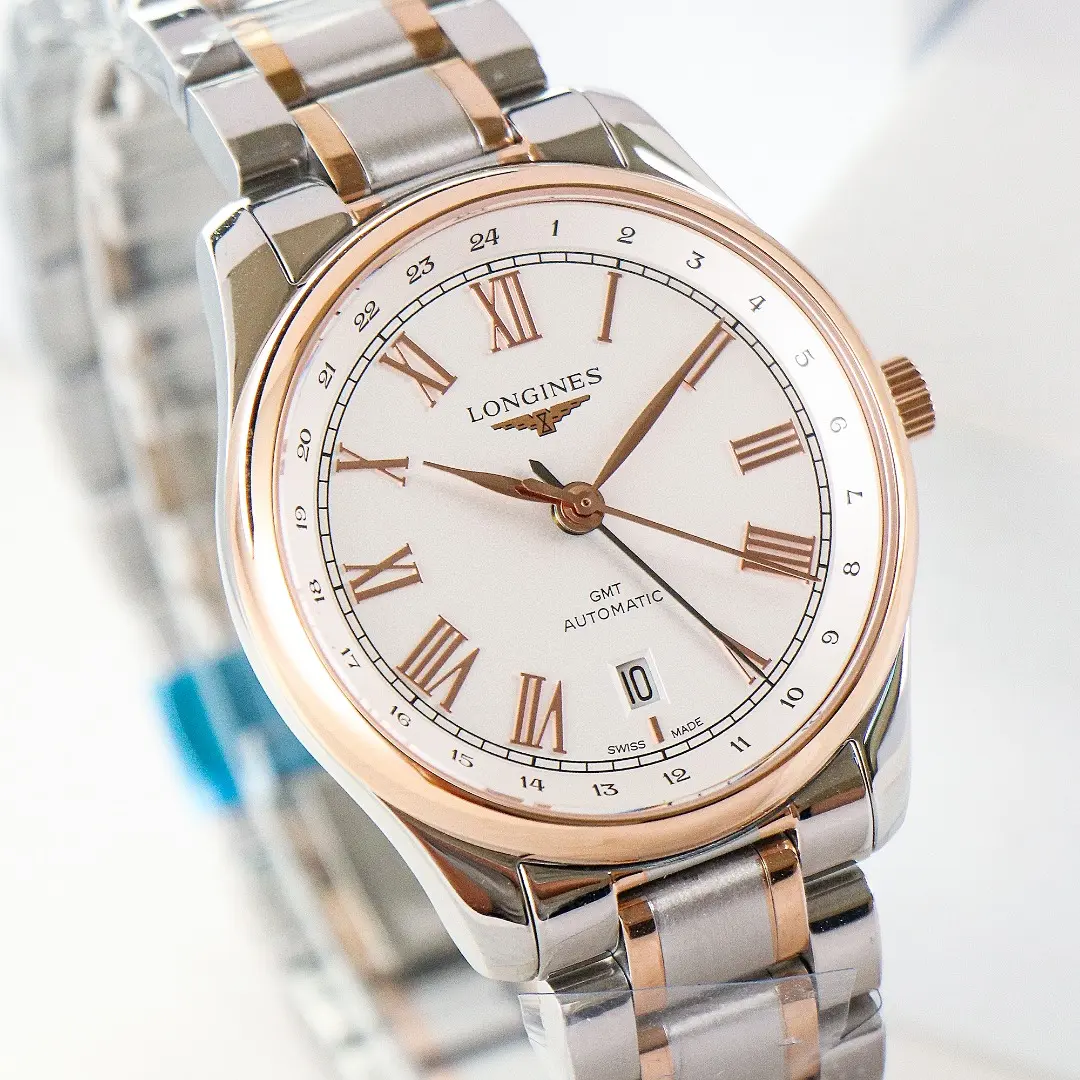 Longines Master Classic Re-Edition GMT Two-Time Zone Watch – White Dial, Two-Tone Stainless Steel and Rose Gold Bracelet, 40mm Case, Italian Grey Leather Strap Option