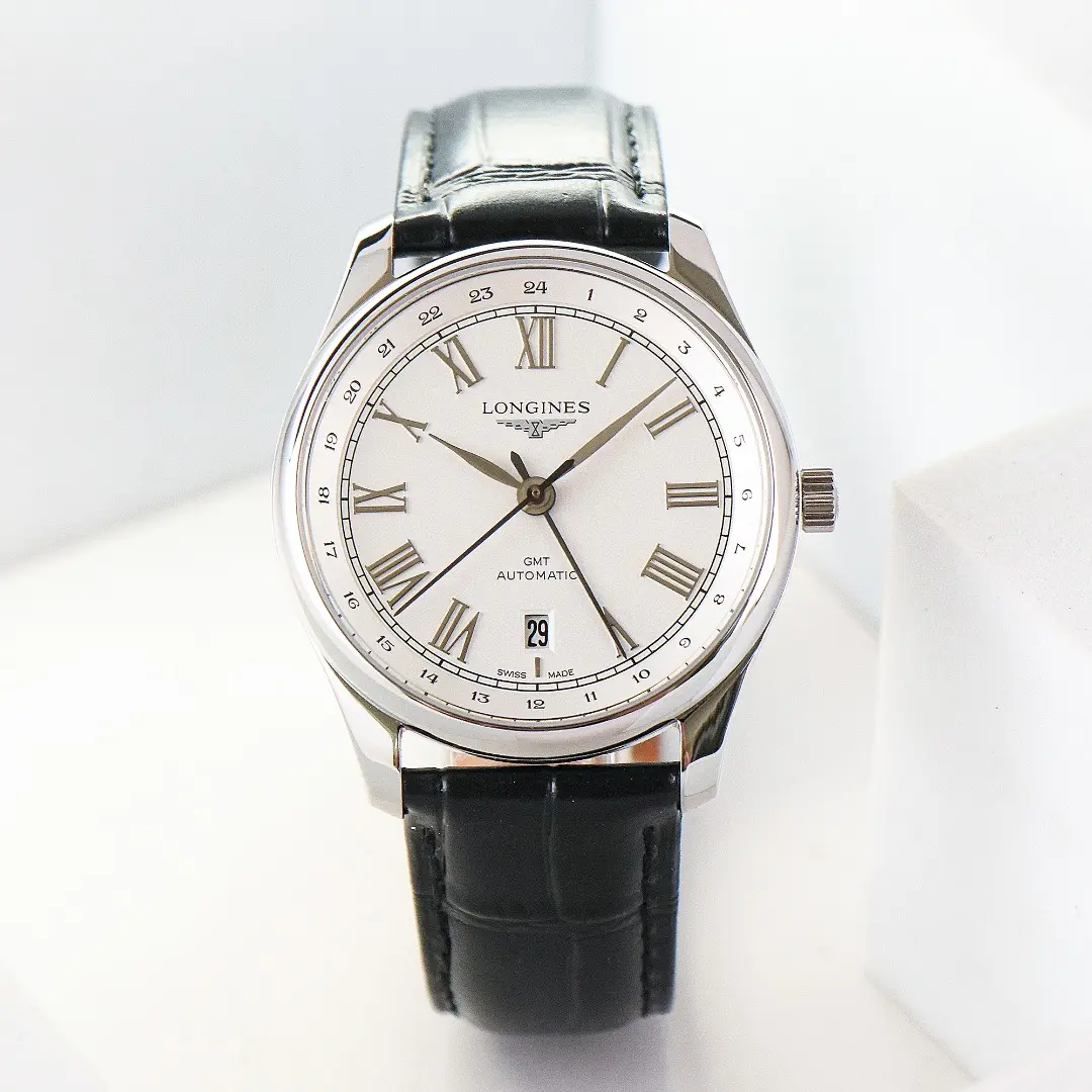 Longines Master Collection Classic Reproduction GMT Dual Time Watch – White Dial, Black Leather Strap, Roman Numerals