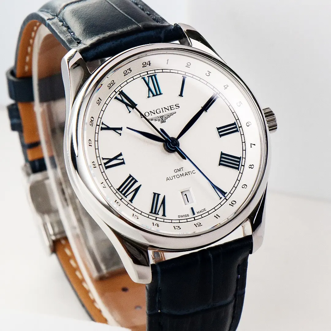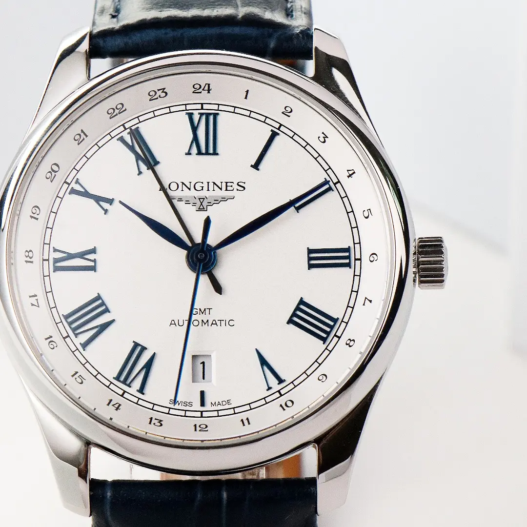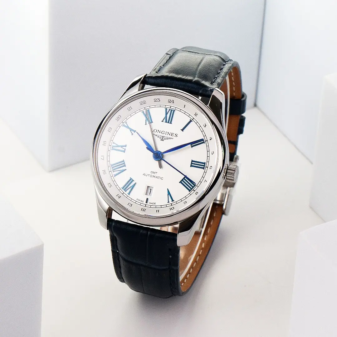– **Elegant Design:** The Longines Master Collection GMT Watch features a sophisticated design with a white dial, blue hands, and Roman numerals, enhancing visual depth and elegance.