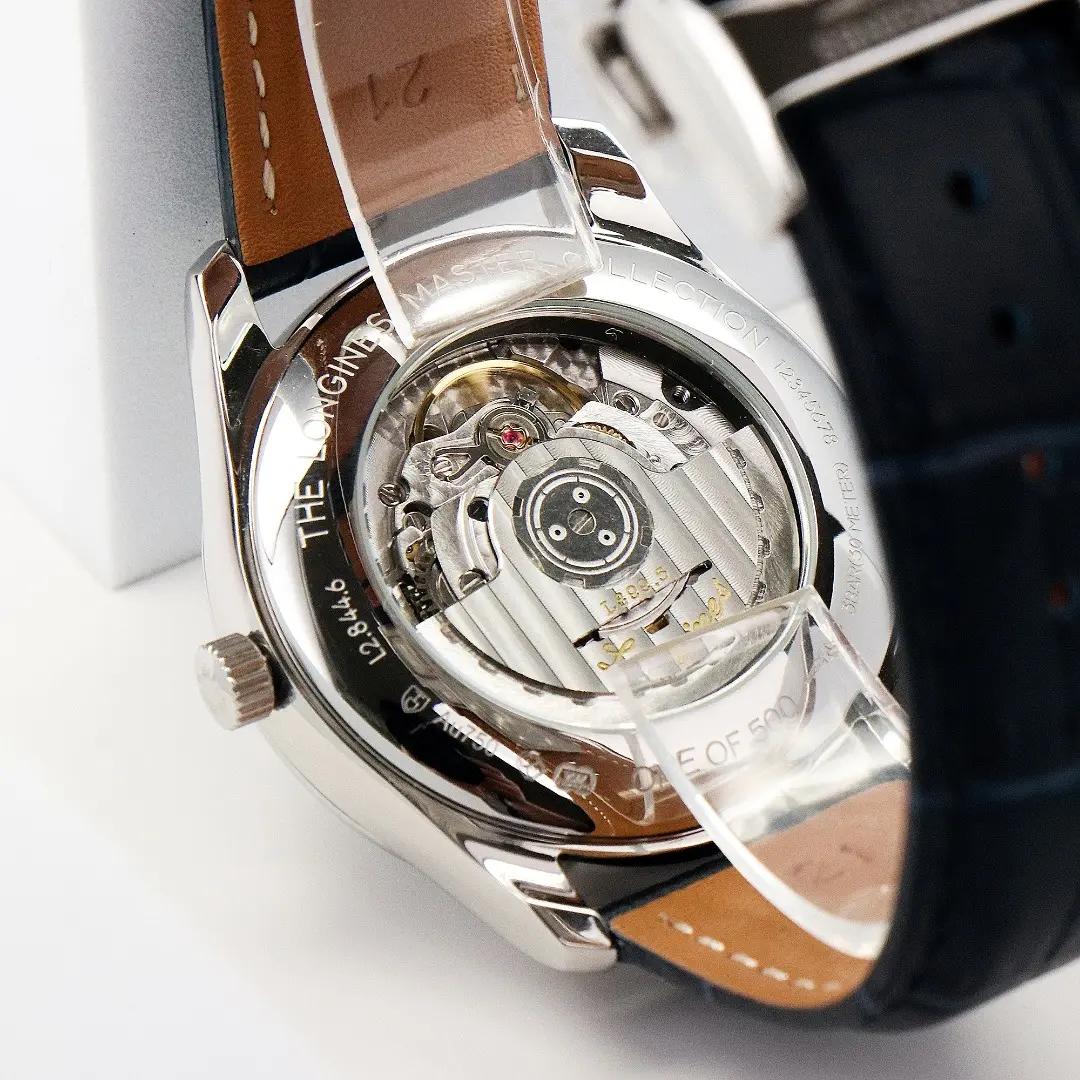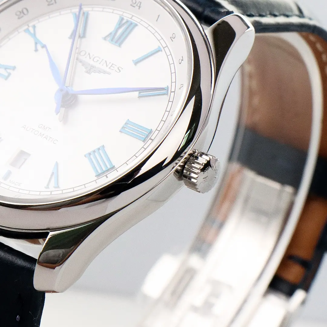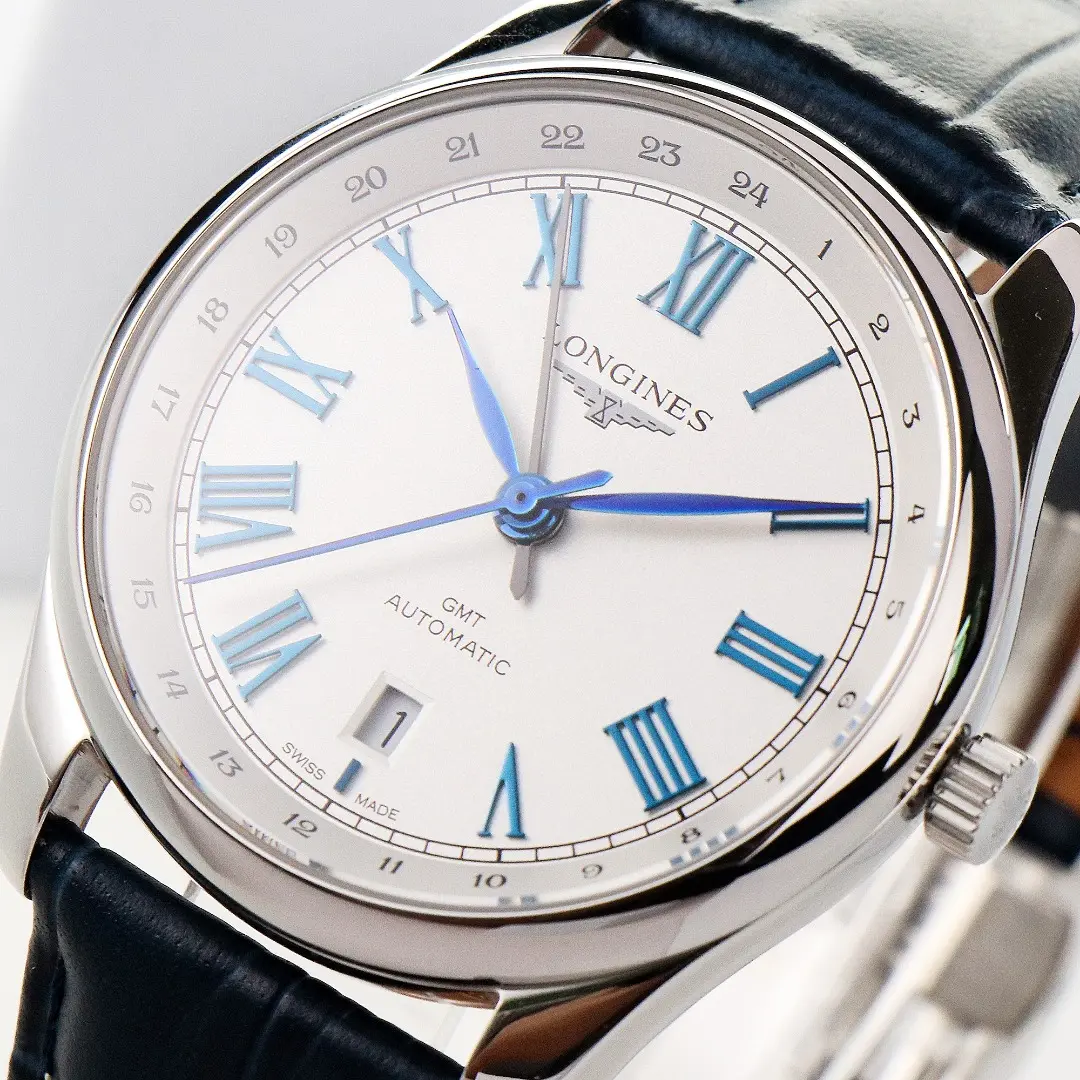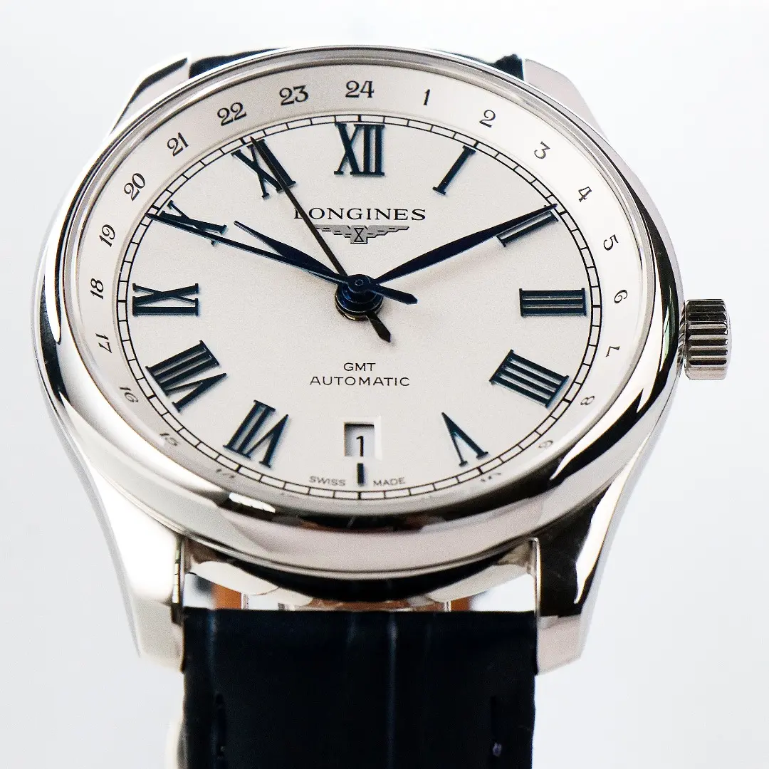 – **Elegant Design:** The Longines Master Collection GMT Watch features a sophisticated design with a white dial, blue hands, and Roman numerals, enhancing visual depth and elegance.