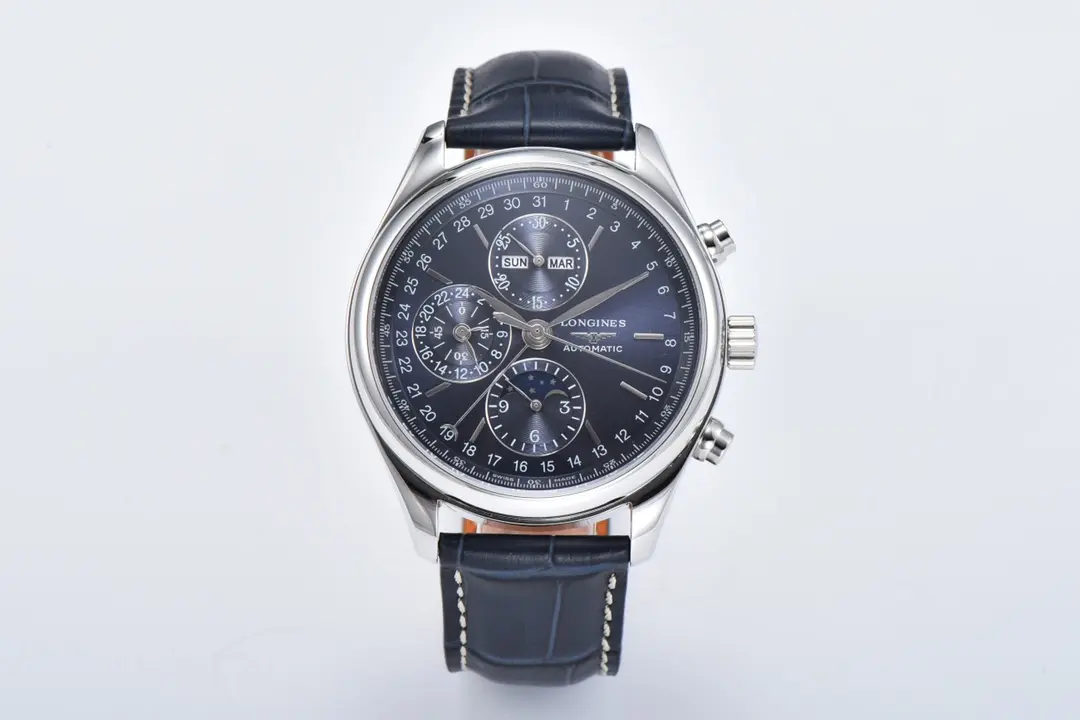 Longines Master Collection Moonphase Chronograph Watch – Blue Dial, Stainless Steel Case, Leather Strap, 42mm, L2.773.4.78.6