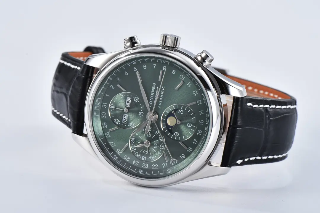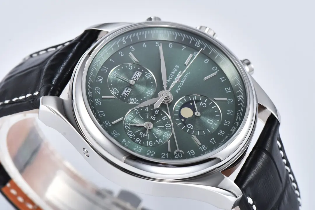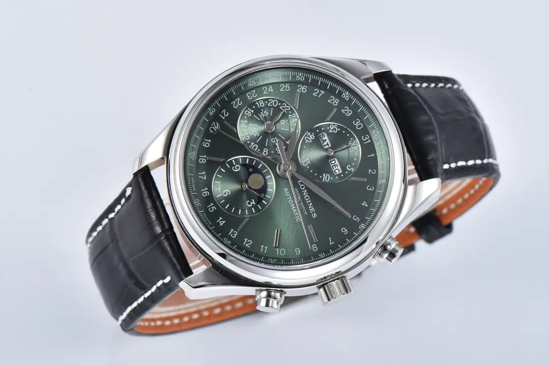 Experience classic elegance with the Longines Master Collection Moon Phase Chronograph Watch Replica. This 42mm timepiece features a silver case, green dial, and black leather strap, blending luxury with functionality. Crafted as a 1:1 super clone watch, it mirrors the original design with impeccable detail, making it a standout choice for enthusiasts seeking a high-quality Replica Watches or a premium Swiss Replica.