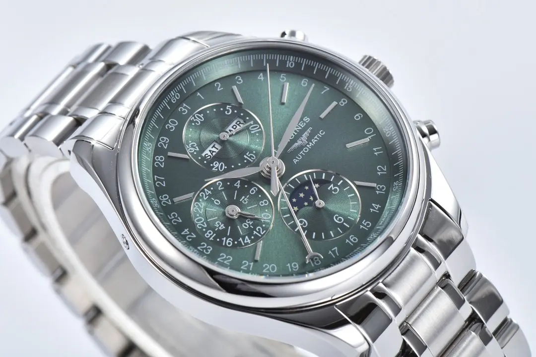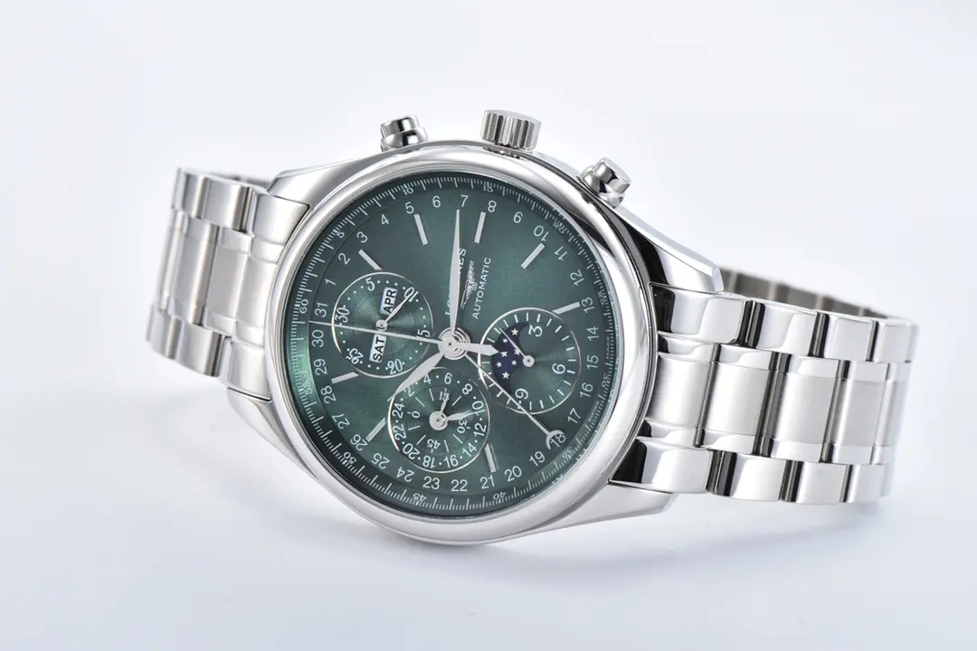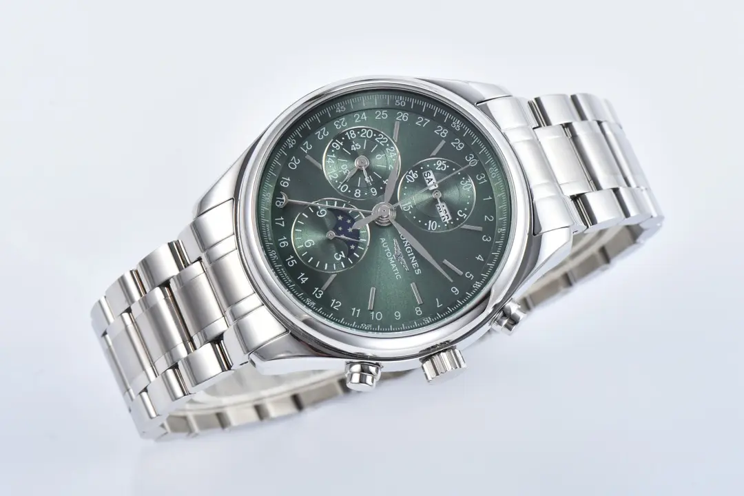 Experience classic elegance with the Longines Master Collection Moon Phase Chronograph Watch Replica. This 42mm silver stainless steel timepiece features a sophisticated green dial, offering both style and functionality. As a 1:1 super clone watch, it mirrors the original design with impeccable precision, making it a standout choice for watch enthusiasts seeking high-quality Replica Watches at an accessible price. For those passionate about exceptional craftsmanship, explore more at ChinaTime to discover an impressive collection of timepieces.