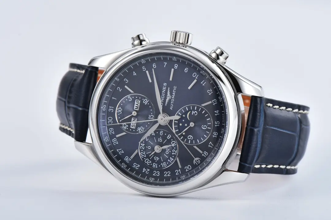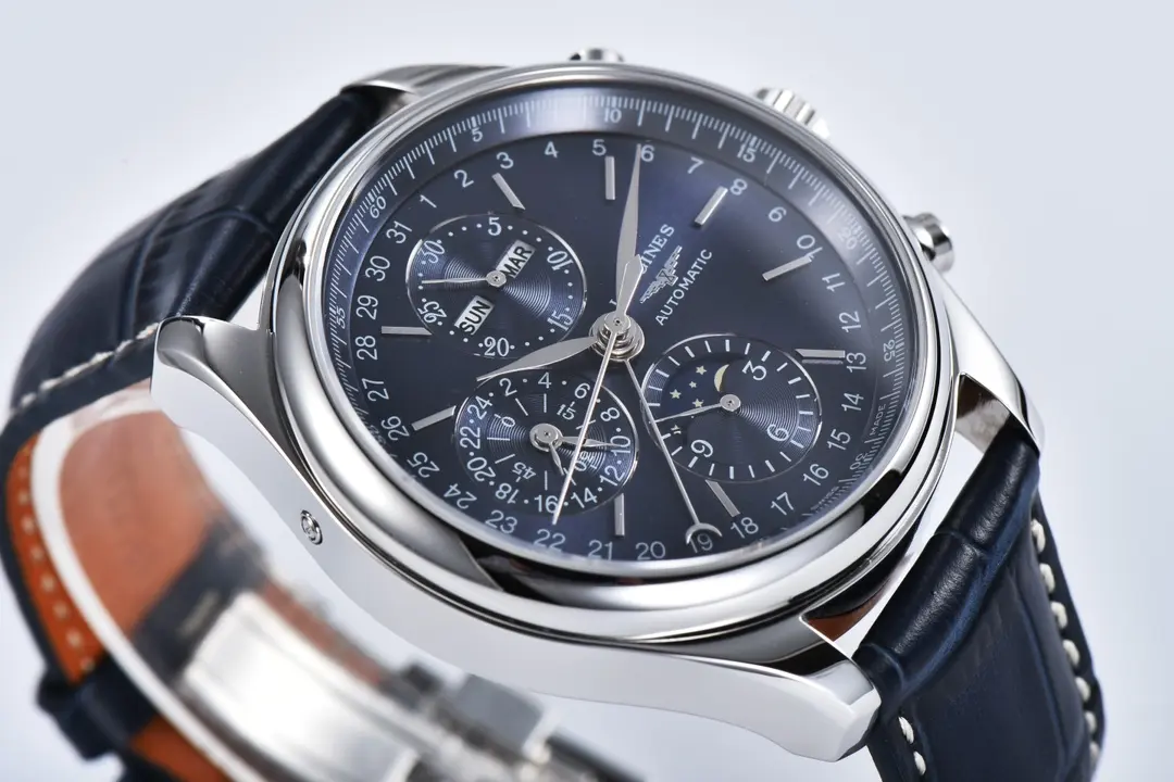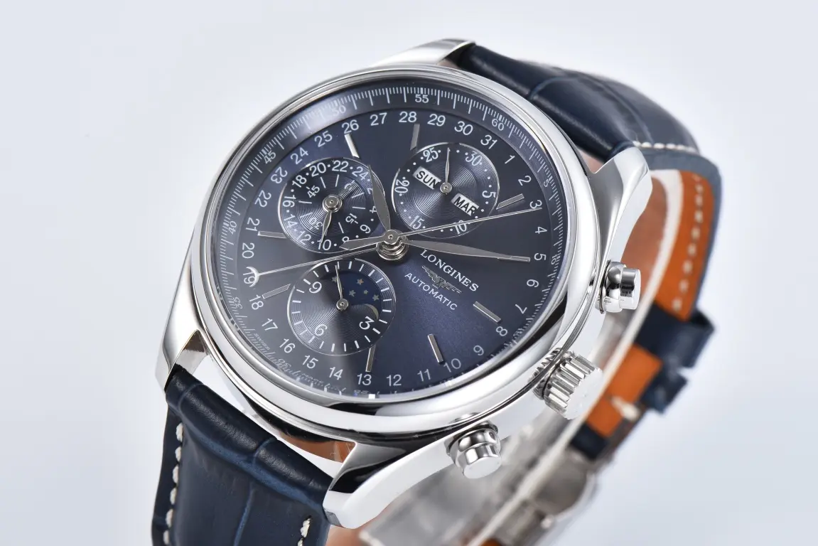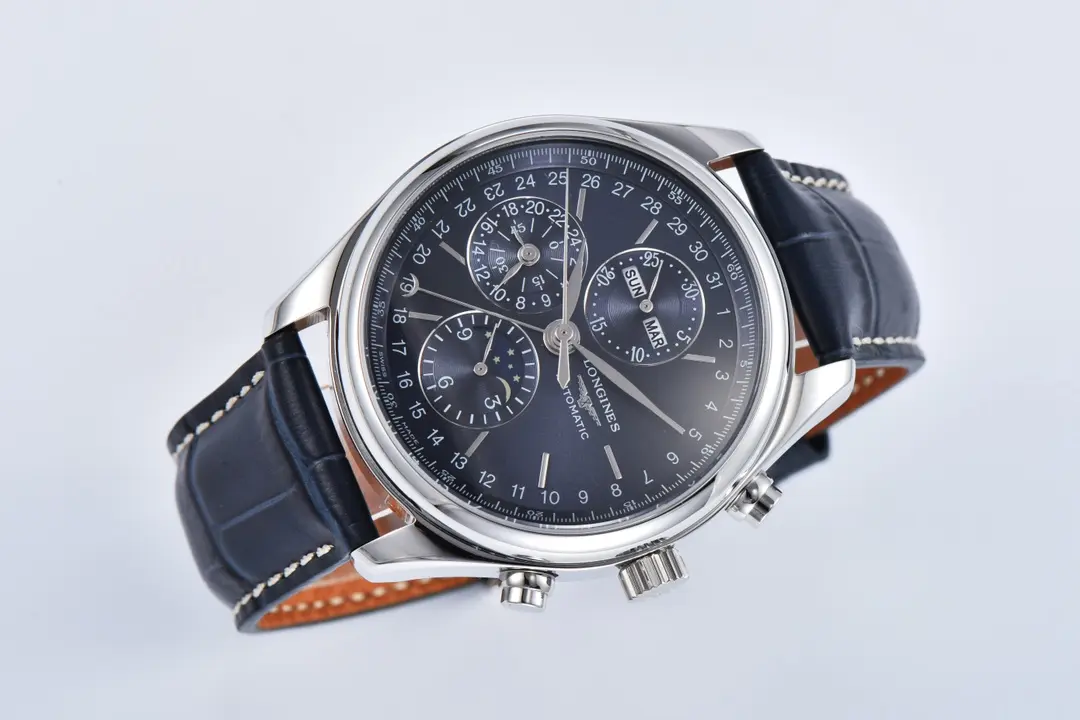 Experience elegance with the Longines Master Collection Moon Phase Chronograph Watch. This 42mm timepiece features a blue dial, stainless steel case, and a leather strap, combining classic style with advanced functionality. As a premium 1:1 super clone watch, it replicates the original design with impeccable detail, making it a standout choice for watch enthusiasts seeking high-quality craftsmanship. Explore this exceptional piece along with other remarkable Replica Watches and discover premium options at ChinaTime to elevate your collection with timeless sophistication.