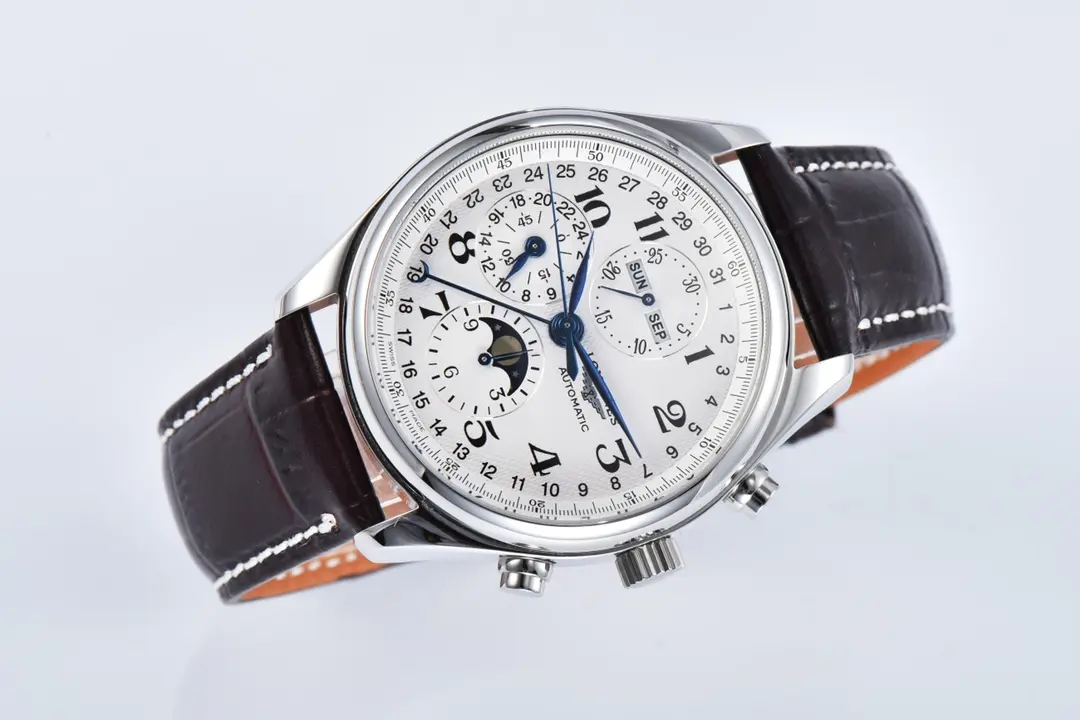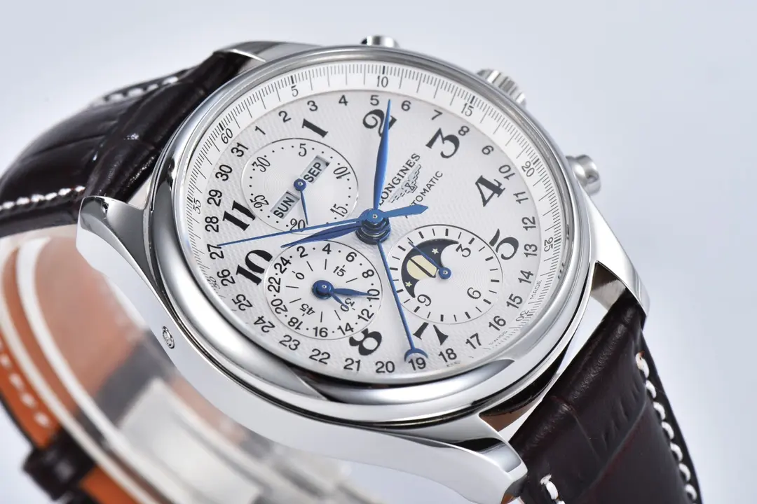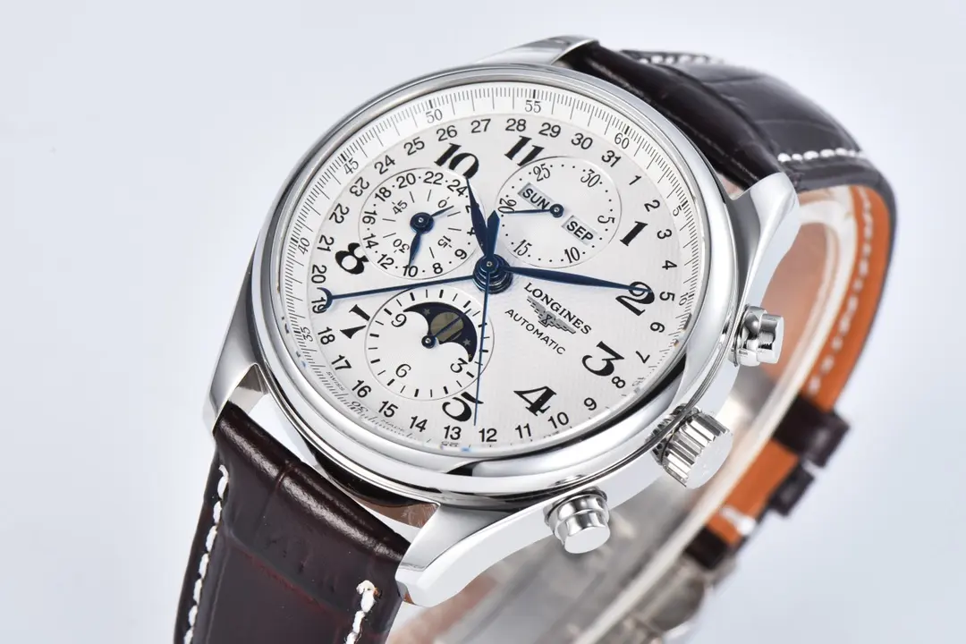 Experience timeless elegance with the Longines Master Collection Moonphase Chronograph Watch. Featuring a silver dial, blue hands, and a brown leather strap, this 42mm timepiece combines classic style with modern functionality. As a premium 1:1 super clone watch, it mirrors the original design with impeccable detail and craftsmanship. Whether you’re a collector or simply seeking a high-quality piece among Replica Watches, this timepiece offers unmatched sophistication and precision at ChinaTime.