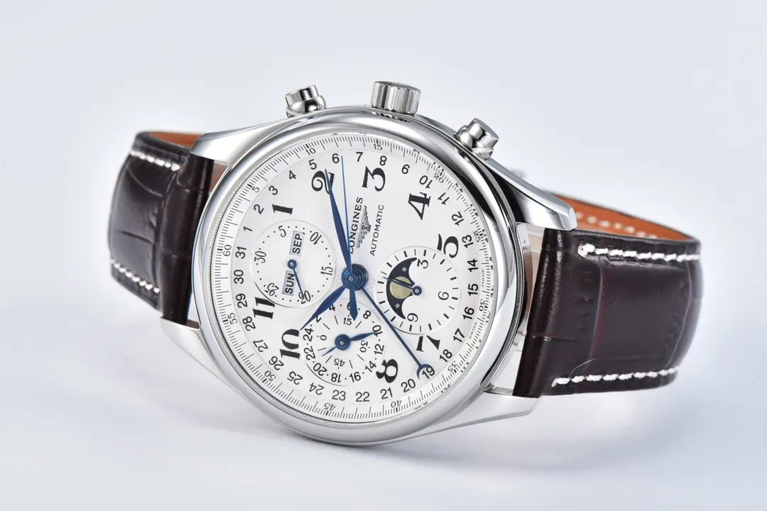 Longines Master Collection Moonphase Chronograph Watch – Silver Dial, Blue Hands, Brown Leather Strap, 42mm Case