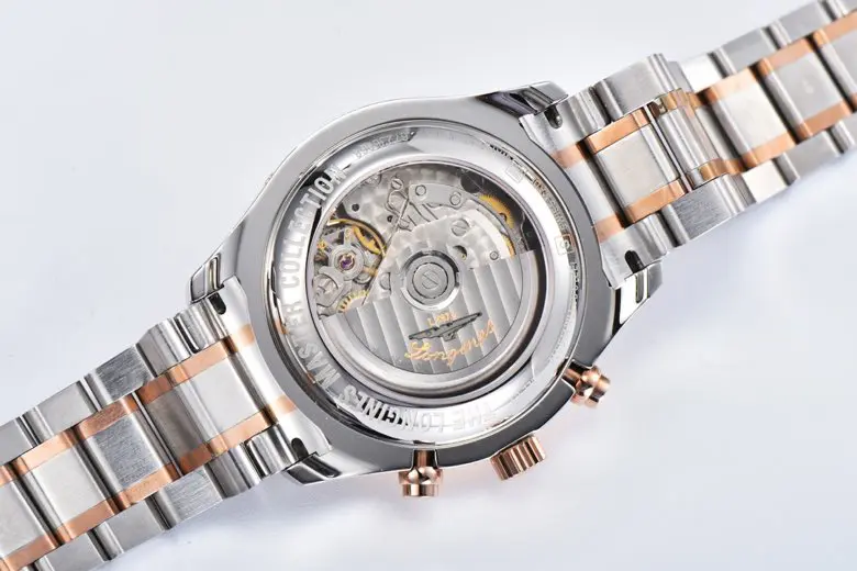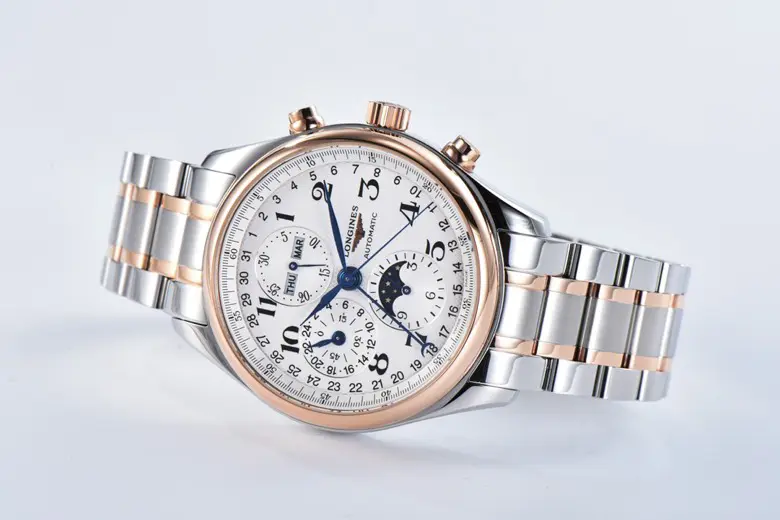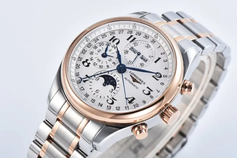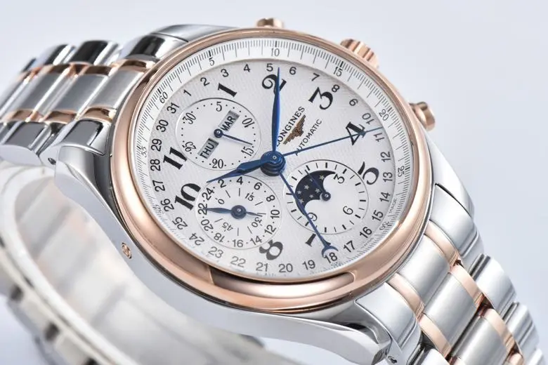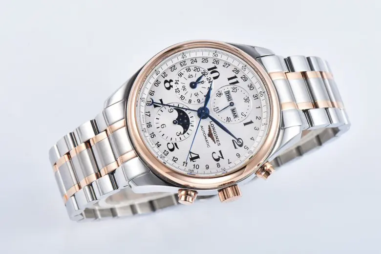 The Longines Master Collection Moonphase Chronograph Watch combines classic elegance with advanced functionality. Featuring a silver dial and a two-tone stainless steel and rose gold bracelet, this 42mm timepiece is both a statement of style and precision. As a high-quality watch replica, it mirrors the original design with impeccable detail. Crafted with care, this 1:1 super clone watch offers an authentic experience at a fraction of the cost, making it a perfect choice for watch enthusiasts seeking excellence through Replica Watches and exceptional craftsmanship inspired by Swiss Replica standards.