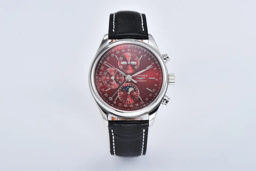 Longines Master Collection Moonphase Chronograph Watch – Red Dial, Stainless Steel Case, Black Leather Strap, 42mm
