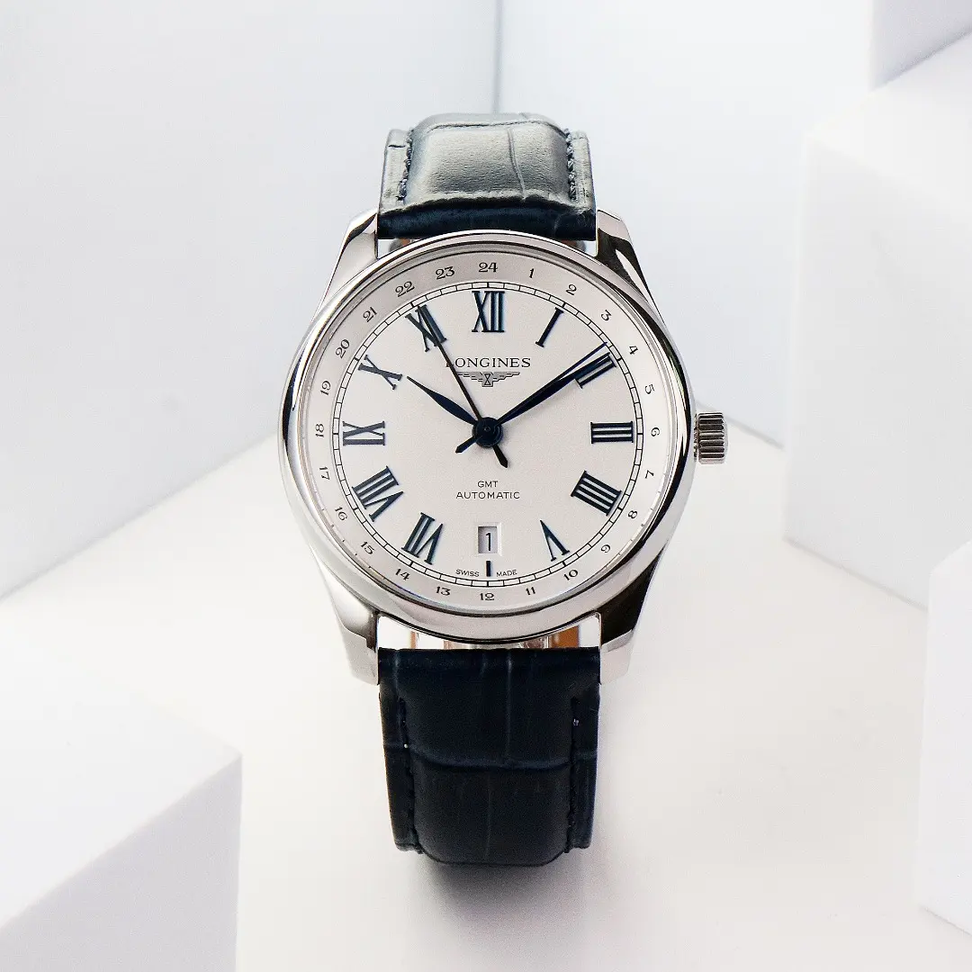 Longines Master Collection GMT Watch – White Dial with Blue Hands, 40mm Stainless Steel Case, Italian Grey Leather Strap