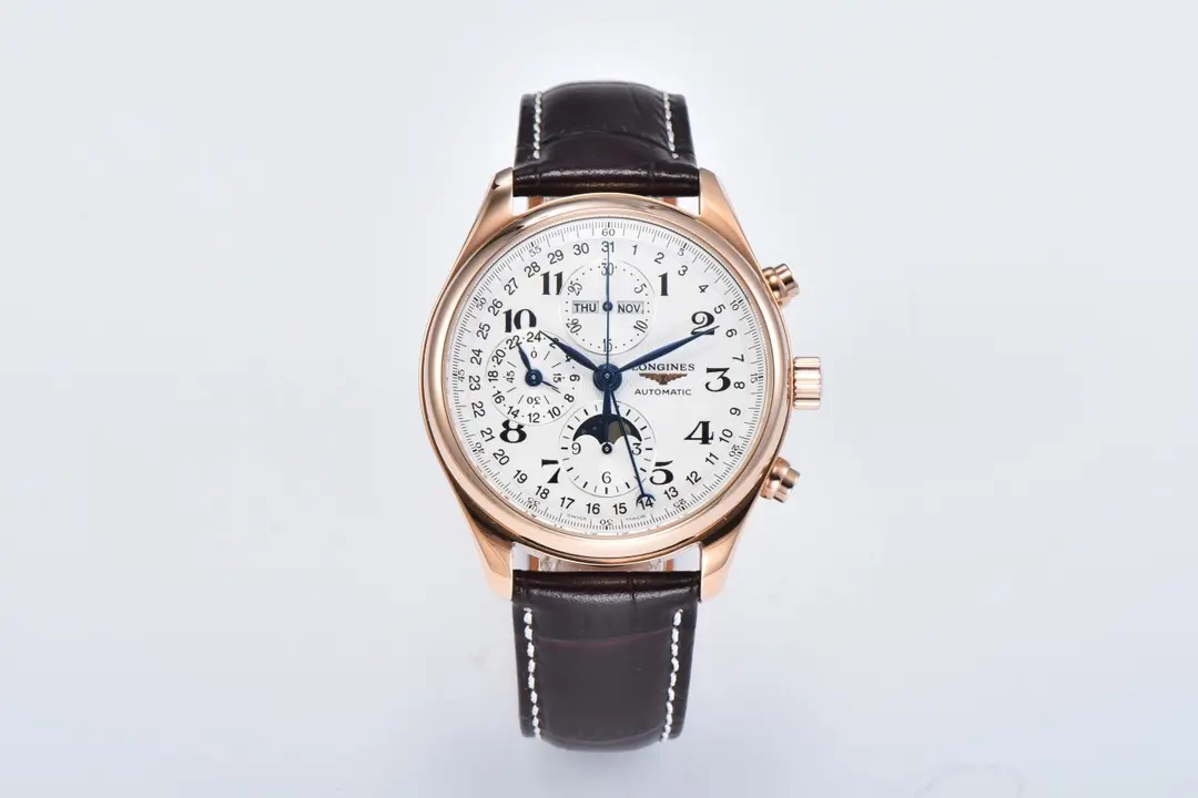 Longines Master Collection Moonphase Chronograph Watch – Rose Gold with White Dial and Brown Leather Strap