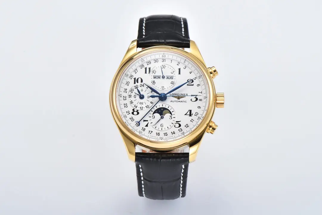 Longines Master Collection Moon Phase Chronograph Watch – Gold Case, Black Leather Strap, White Dial