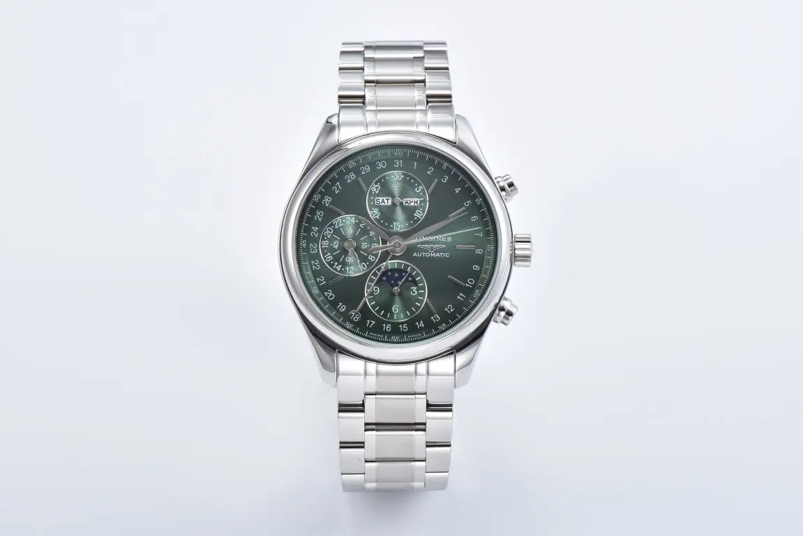 Longines Master Collection Moon Phase Chronograph Watch – Silver Stainless Steel with Green Dial, 42mm