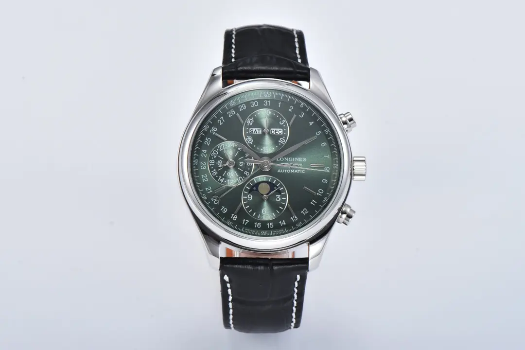 Longines Master Collection Moon Phase Chronograph Watch – Silver Case, Black Leather Strap, Green Dial, Classic Elegant Style