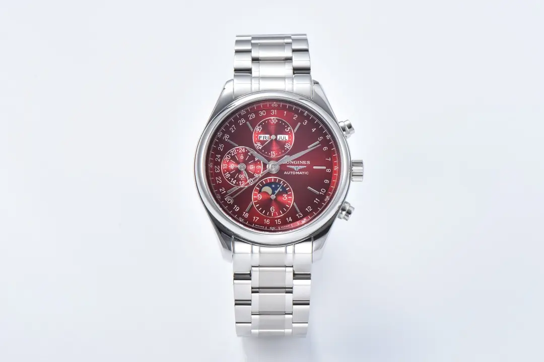 Longines Master Collection Moonphase Chronograph Watch – Red Dial, Stainless Steel Bracelet, 42mm Case