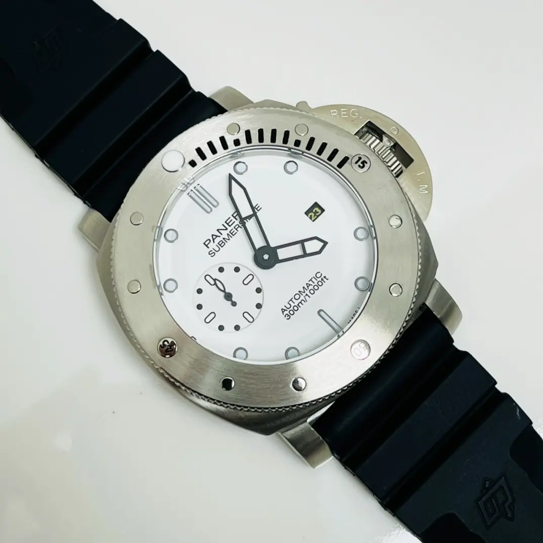 Experience the timeless elegance of the PANERAI Submersible Automatic Watch, a masterpiece among super clone watches. Featuring a striking white dial encased in robust stainless steel, this watch is complemented by a comfortable black rubber strap. It exudes noble style and intelligent sophistication, making it a standout choice for enthusiasts of Replica Watches. Crafted with precision, this piece reflects the allure of high-end imitation luxury watches, offering unmatched quality and design.