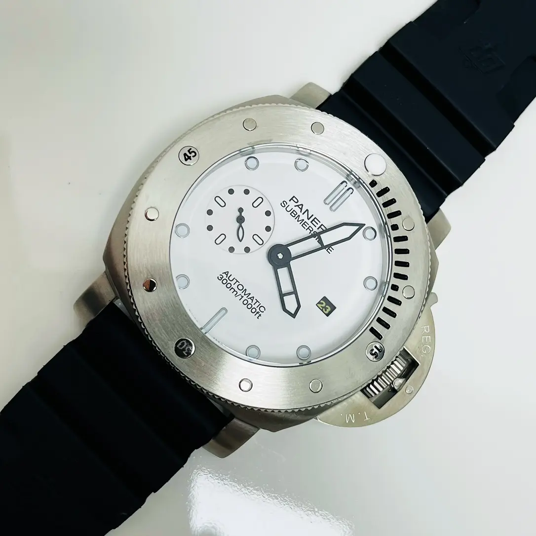 Breitling Aviation PANERAI Submersible Automatic Watch – White Dial, 316L Stainless Steel Case, Black Rubber Strap