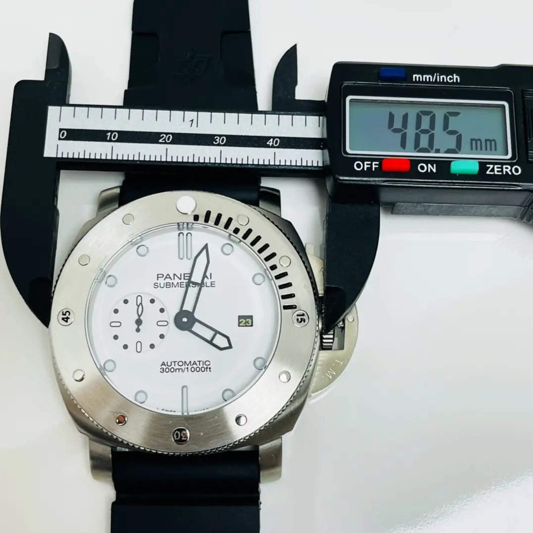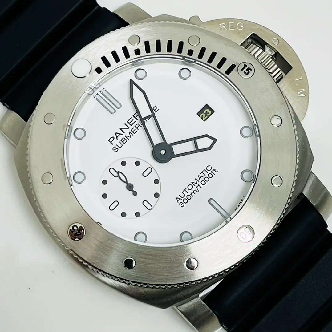 PANERAI Submersible Automatic Watch – White Dial, 316L Stainless Steel Case, Black Rubber Strap, 48.5mm Diameter, Noble Style