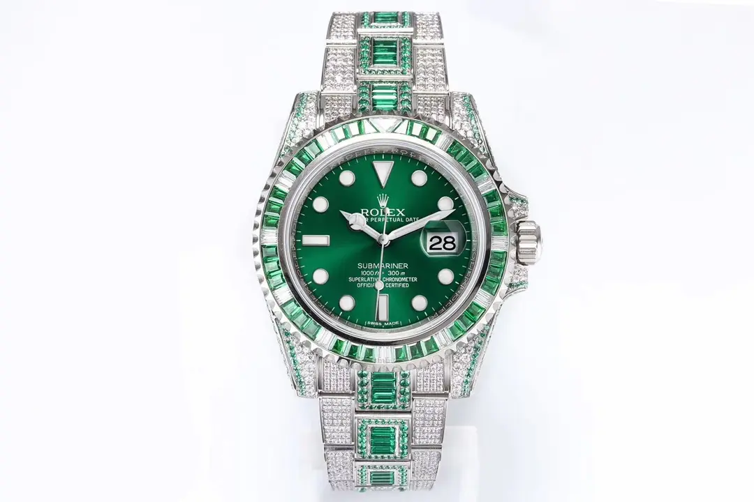 Experience unparalleled luxury with this custom Rolex Submariner, featuring a green diamond-set design. Crafted from 904L stainless steel with Swarovski crystals, it’s the epitome of exclusivity and sophistication. For those seeking high-quality replica watches, this timepiece stands out as a remarkable choice in the world of luxury watch craftsmanship.