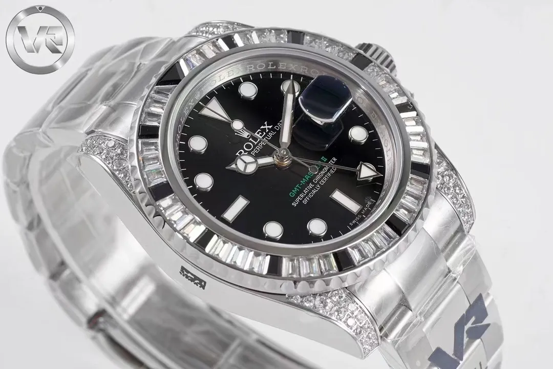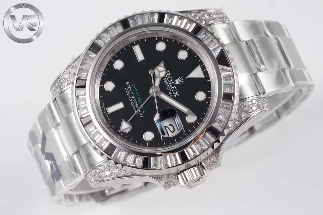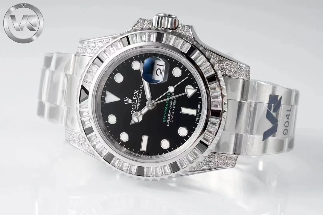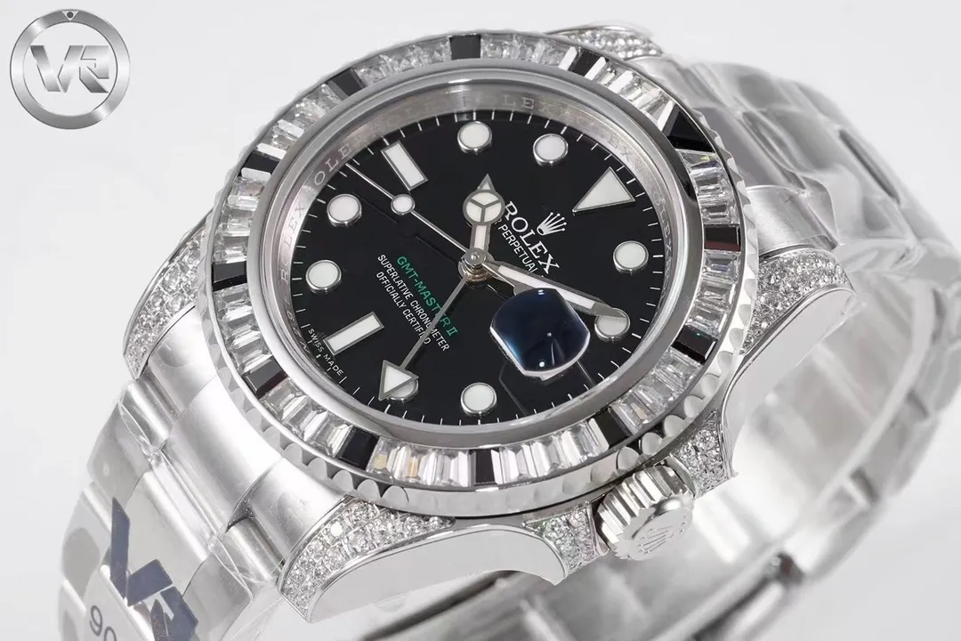 Experience luxury redefined with the VR Rolex GMT II Black Diamond Watch. This 40mm masterpiece, crafted from premium 904L Oyster steel, is adorned with Swarovski crystals, offering unparalleled elegance and durability. For those seeking the finest Replica Watches, this timepiece stands out as a top choice in the world of high-quality craftsmanship. Discover more exceptional pieces and explore the best in replica watches to elevate your collection with timeless style.